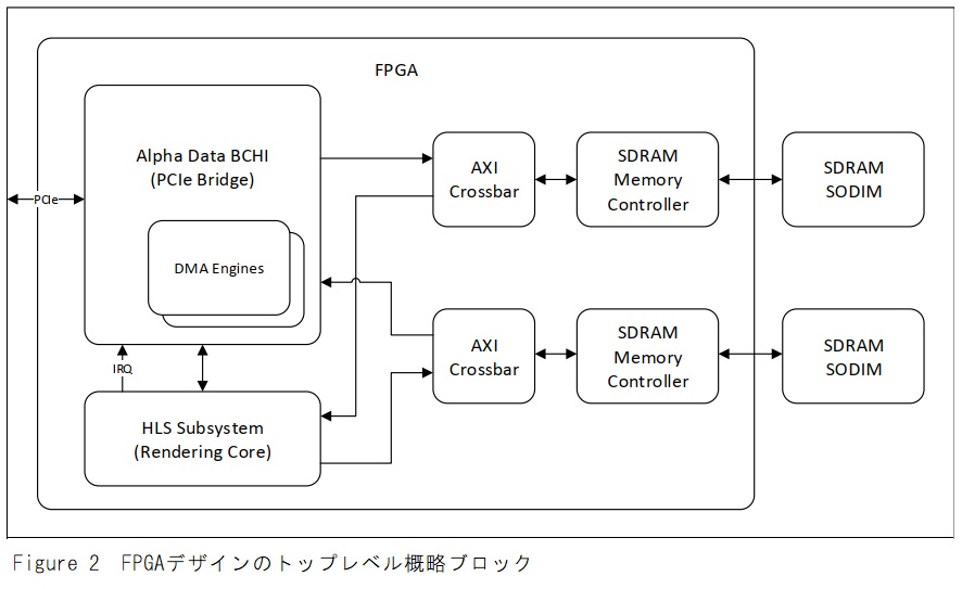 このデモで選択されたFPGAカードはADM-PCIE-KU3です。これには、FPGA用のオフチップメモリを提供する2つのSODIMMスロットがあります。各SODIMMにはメモリコントローラが必要です。クロスバーは、(a)ホストシステム(データと結果のアップロードとダウンロードのため)、および(b)レンダリングアルゴリズムを実行するHLSサブシステムの両方によって、メモリへの共有アクセスを可能にします。