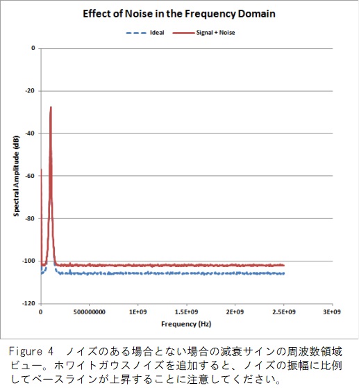 ダム成分を追加することにより、デジタイザ (A/Dボード) の小さな振幅値を分解する能力を制限します。これはFigure 3で見ることができます。これはFigure 1と同じ減衰サイン信号波形ですが、振幅ノイズがある場合とない場合の信号を時間領域で比較しています。