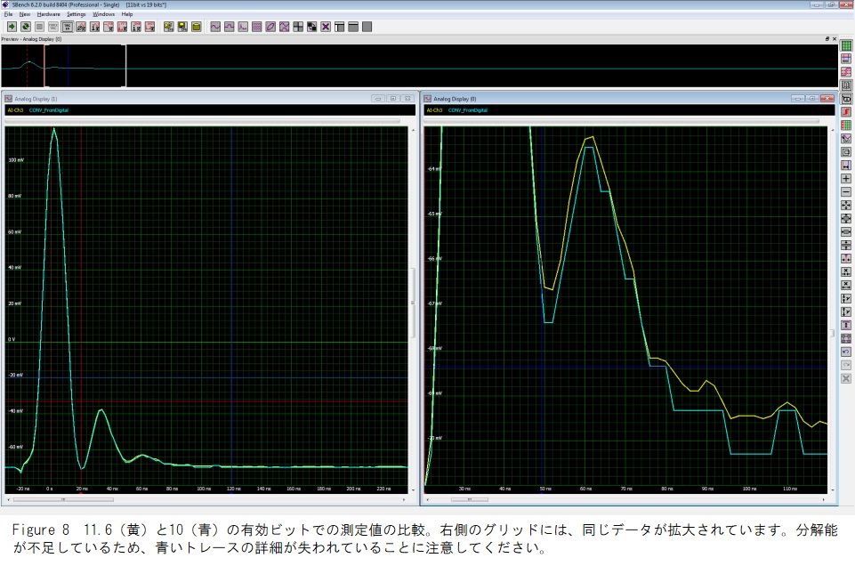 ここで異なる分解能のデジタイザ (A/Dボード) を使用した場合の波形の形状を見てみましょう。