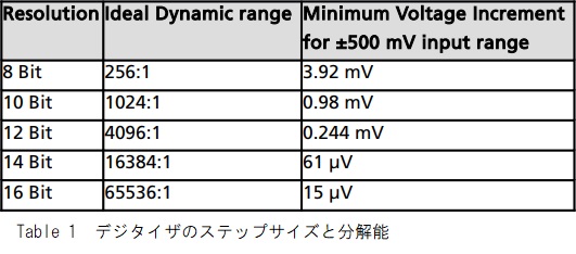 デジタイザ (A/Dボード) は、アナログ-デジタルコンバータ(ADC)を使用して、アナログ信号をデジタルサンプル値に変換します。ADCの分解能は、入力信号をサンプリングしてデジタル化するために使用するビット数です。nビットADCの場合、生成可能な離散デジタルレベルの数は2nです。したがって、12ビットのデジタイザ (A/Dボード) は212または4096レベルに分解できます。最下位ビット(lsb)は、検出できる最小の間隔を表し、12ビットのデジタイザ (A/Dボード) の場合、1/4096または2.4 x 10-4です。lsbを電圧に変換するには、デジタイザ (A/Dボード) の入力範囲(電圧値)を、デジタイザ (A/Dボード) の分解能で除算します。Table 1は、8~16ビットの分解能を持つデジタイザ (A/Dボード) の1ボルト(±500 mV)入力範囲のlsbを示しています。