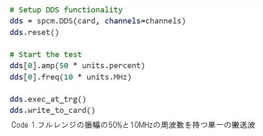 Spectrum InstrumentationのWebサイトまたはGitHubリポジトリ(Pythonのみ)には、さまざまなプログラミング言語の例が多数用意されています。以下では、新しいPythonパッケージに限定して説明します。Pythonパッケージを使用するにはまずGitHubのチュートリアルを読んでください。このチュートリアルでは、インストールと基本的な使用方法が説明されています。ここでは、DDSファームウェアオプションを使用します。DDS専用の例については、GitHubのdds-examplesフォルダを参照してください。
